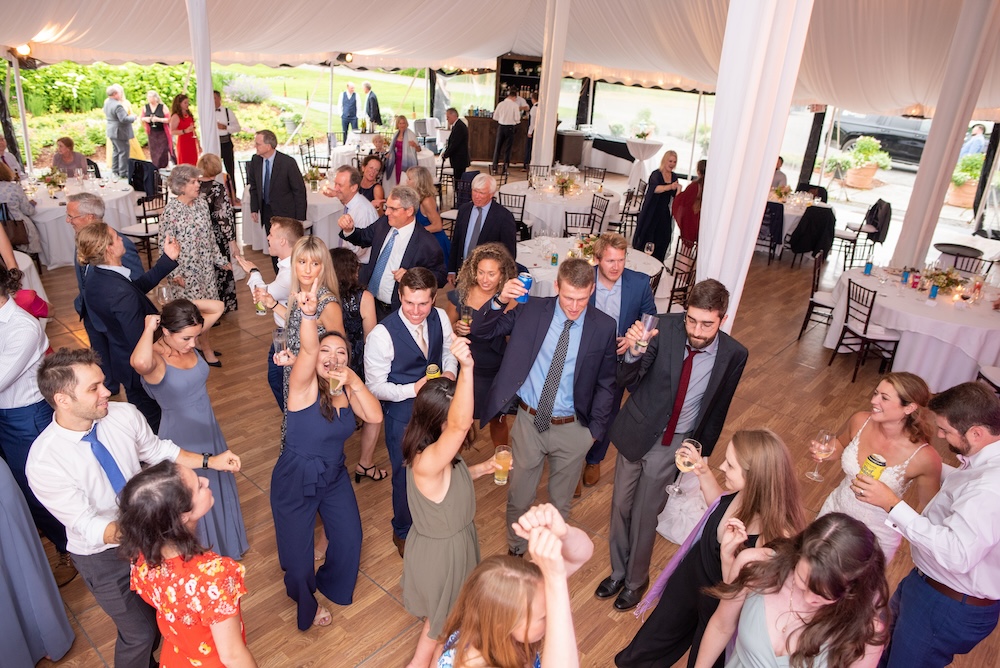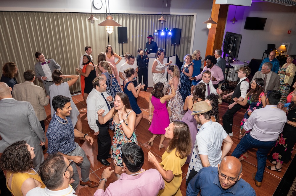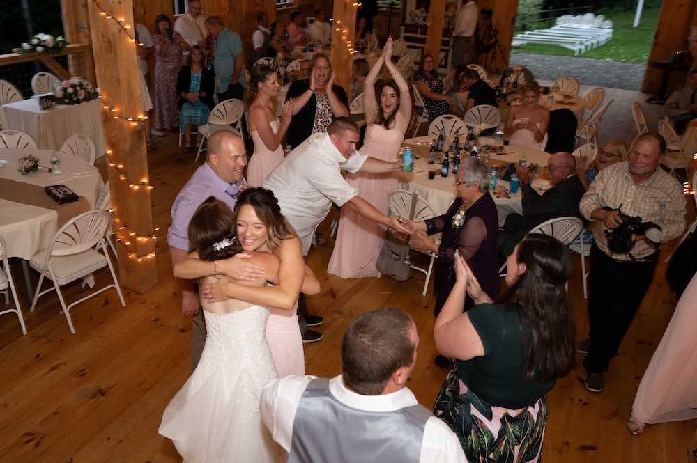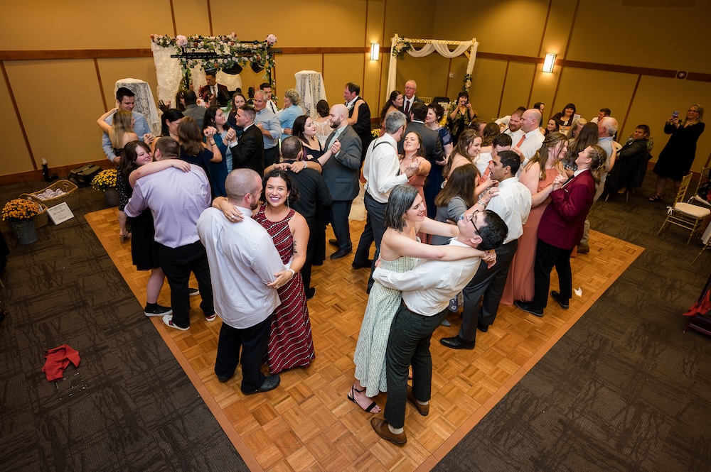 More often, especially once the crazy dancefloor at a wedding begins, I use a camera on a monopod to get the birds eye view. I use a 17-28 wide-angle lens, or sometimes a 20mm. Both give a very large angle of view, so I can show the entire dance floor at once. Since I use 3 cameras at EVERY wedding, I leave the wide-angle lens always mounted and ready to go, so i never miss a thing by changing lenses. I have been doing this for a few decades, and it gives me one more tool to be distinctive, and offers a look that most photographers don’t do. Certainly not the most important photos of the wedding day, but a lot of fun for sure!
